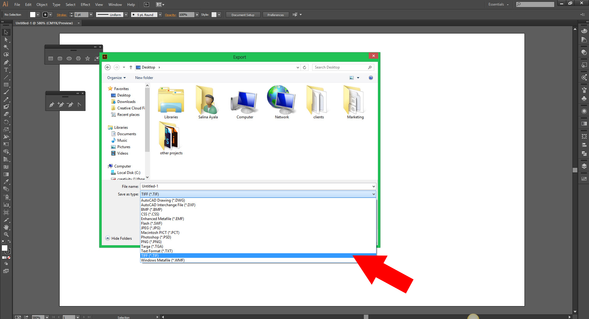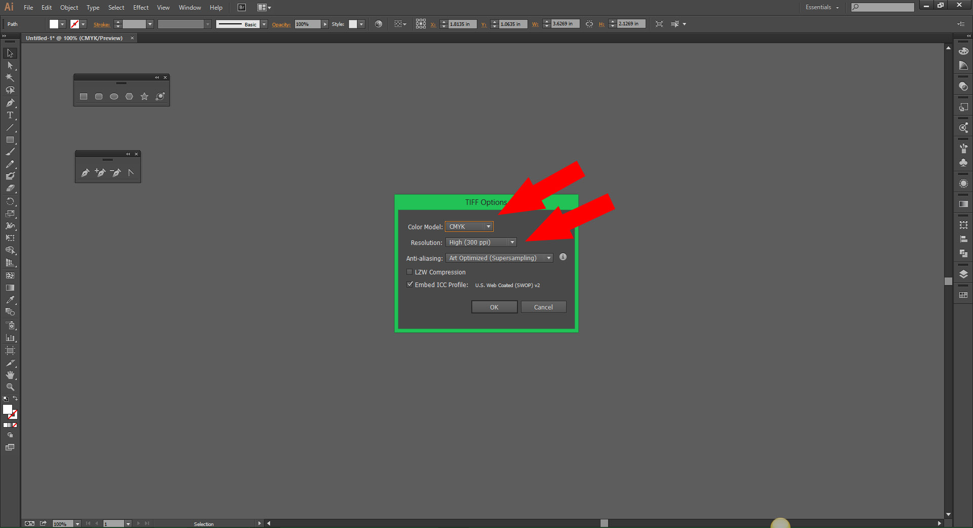 Wählen Sie "Datei"> "Exportieren"> und wählen Sie "TIFF-Format" aus dem Dropdown-Menü. Das Farbmodell sollte CMYK sein und eine Auflösung von 300ppi haben. Vergewissern Sie sich dass sie die Datei in einer Stelle die leicht zu erinnern ist, speichern.